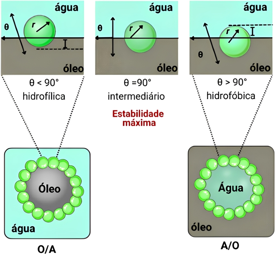 As partículas sólidas devem ser molháveis tanto pela fase aquosa quanto pela fase oleosa, indicando a capacidade de se posicionar na interface óleo-água, estabilizando a emulsão. Como ilustrado na Figura 1 acima, os ângulos de contato menor, igual ou maior que 90º, indicam a formação de emulsões O/A, (emulsões O/A ou A/O (depende de outras variáveis), porém de máxima estabilidade) e A/O, respectivamente.